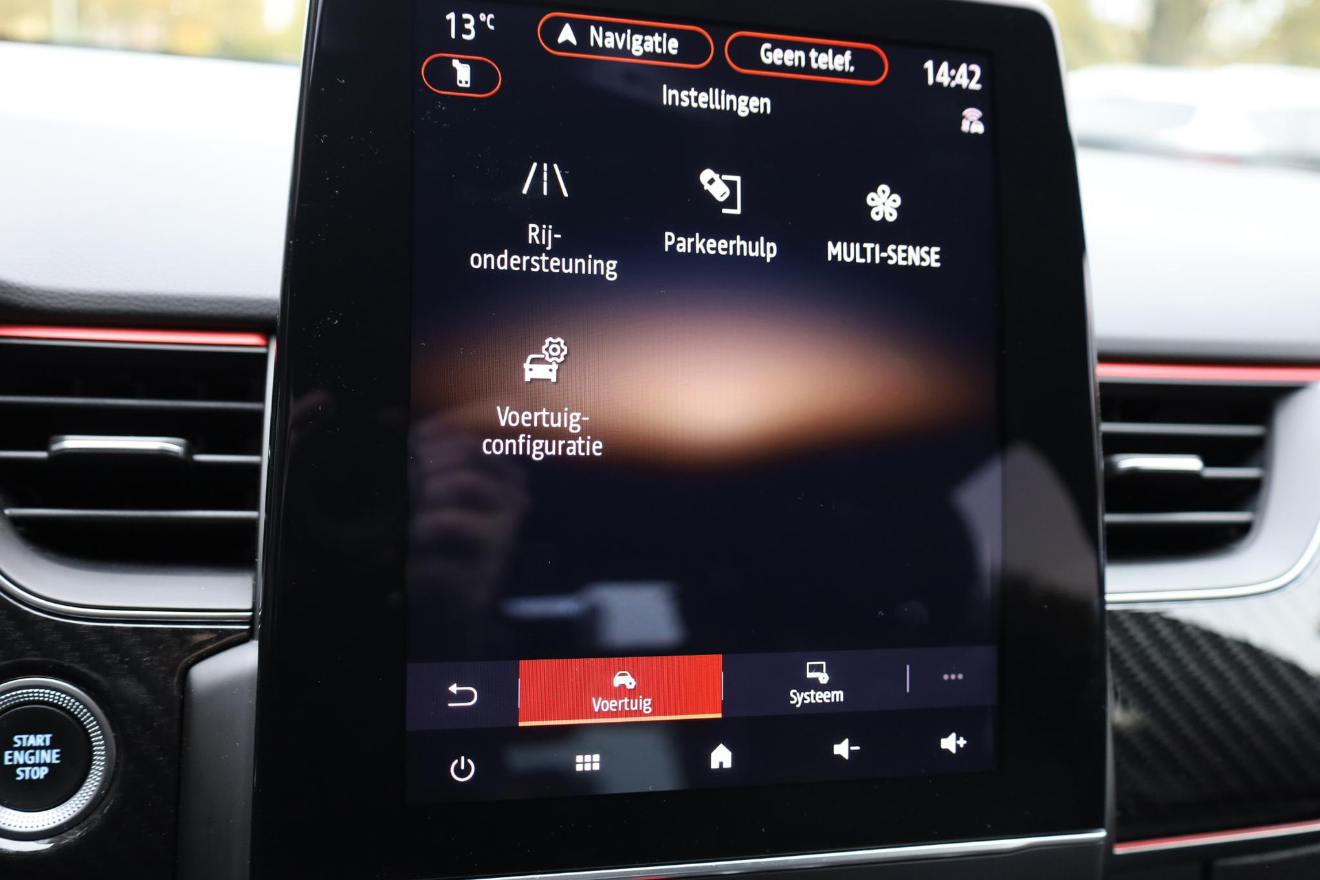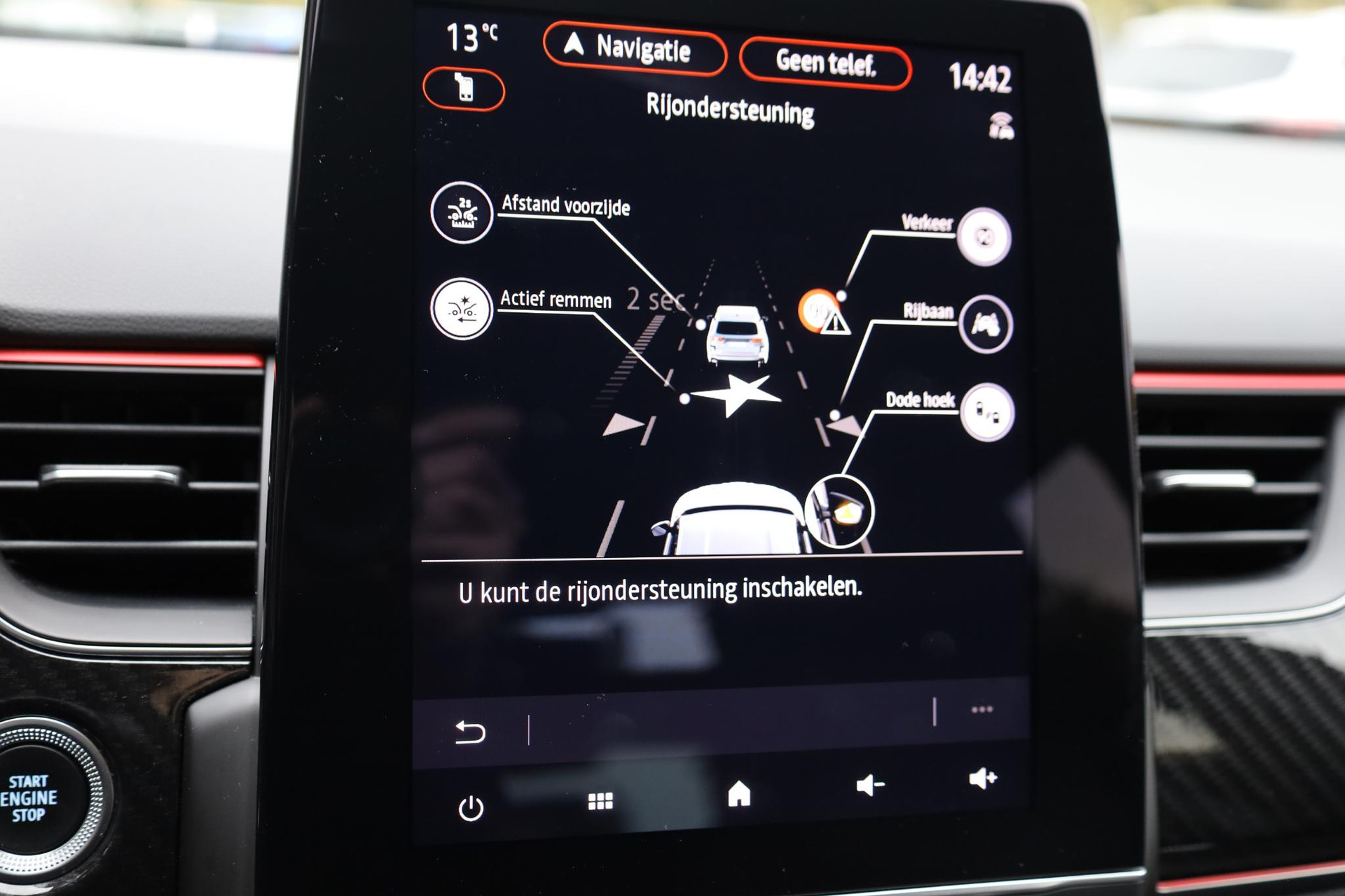 Geavanceerde technische systemen houden tijdens elke rit het verkeer in de gaten en reageren op potentieel gevaarlijke situaties. Een belangrijke bijdrage aan de veiligheid onderweg levert de verkeersbord-detectie in deze Renault. Indien u onbedoeld de rijstrook lijkt te verlaten, reageert het Lane-keeping systeem meteen en corrigeert. Ook als uw aandacht even verslapt, blijft de forward collision warning bij de wekker. Dreigt er een botsing met een voor- of tegenligger, dan waarschuwt het systeem direct. De auto is ook uitgerust met dodehoekdetectie, hill hold functie, autonoom remsysteem en bandenspanningcontrolesysteem.