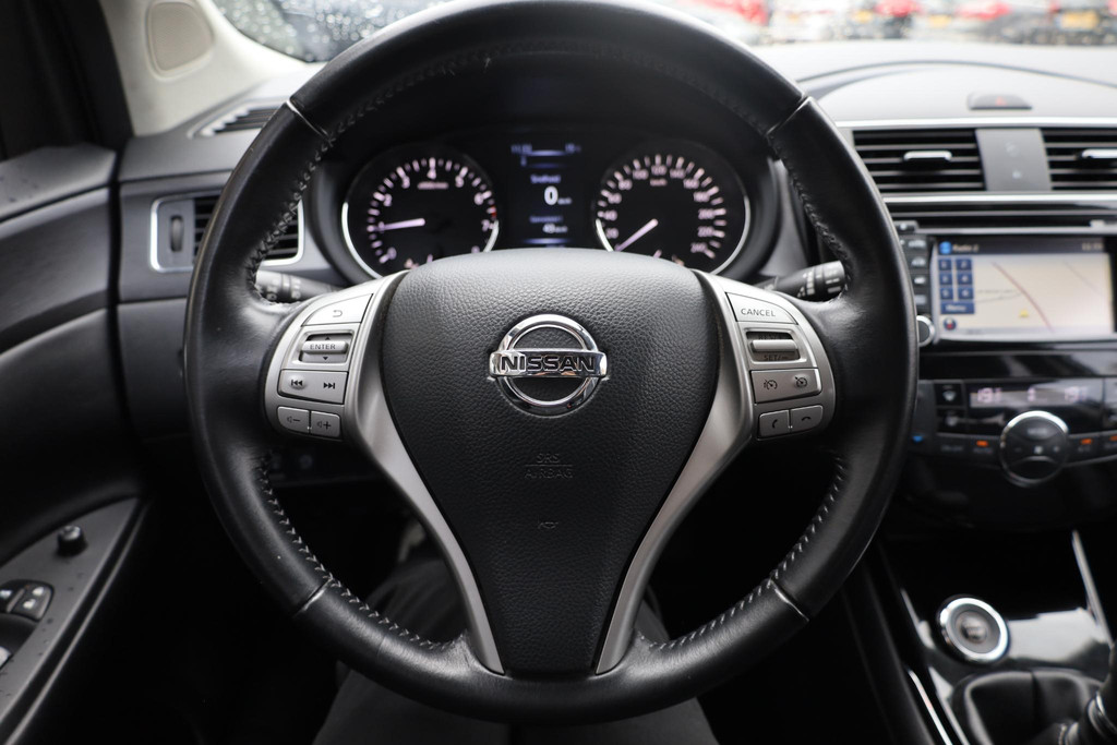 Inparkeren? Met de achteruitrijcamera heeft u er geen omkijken meer naar! Altijd een deskundige gids aan boord, dankzij het full map navigatiesysteem. Met automatische airconditioning hoeft u alleen de gewenste temperatuur in te stellen. Het systeem doet de rest. Een andere zender kiezen. Het geluid harder of zachter zetten. Met de audiobediening op het stuurwiel bedient u de radio veilig met uw handen aan het stuur. De elektronische systemen in deze Nissan helpen u actief om comfortabeler te rijden. Een automatisch inschakelbare verlichting en een regensensor houden de omstandigheden onderweg in de gaten. Deze Nissan is voorzien van cruise control, keyless entry, automatisch dimmende binnenspiegel, lederen stuur en versnellingspook en centrale deurvergrendeling met afstandsbediening.